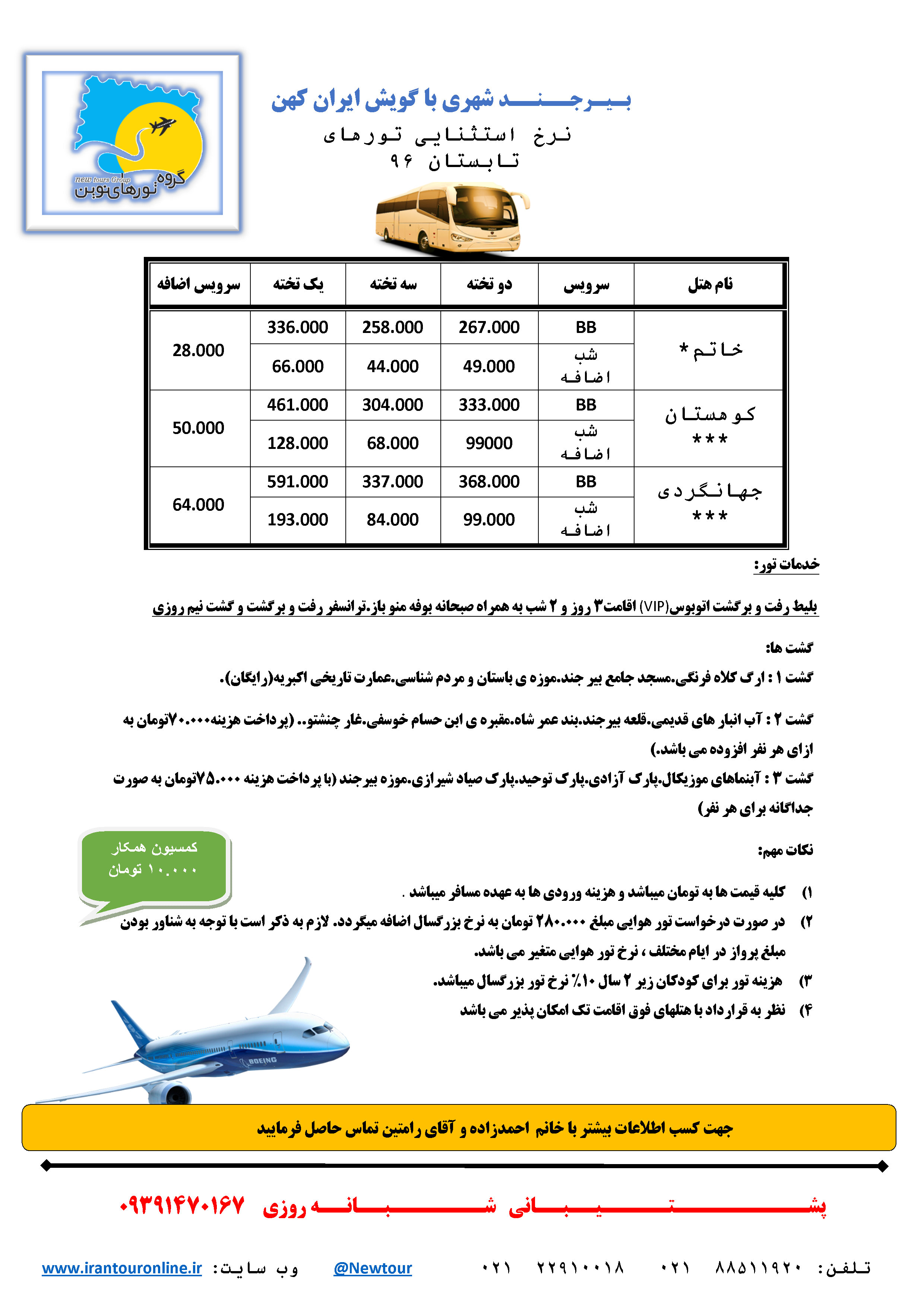 اقامت در هتل1 ستاره هتل خاتم است و اقامت در هتل 3 ستاره کوهستان بوده واقامت در هتل 3 ستاره جهانگردی می باشد