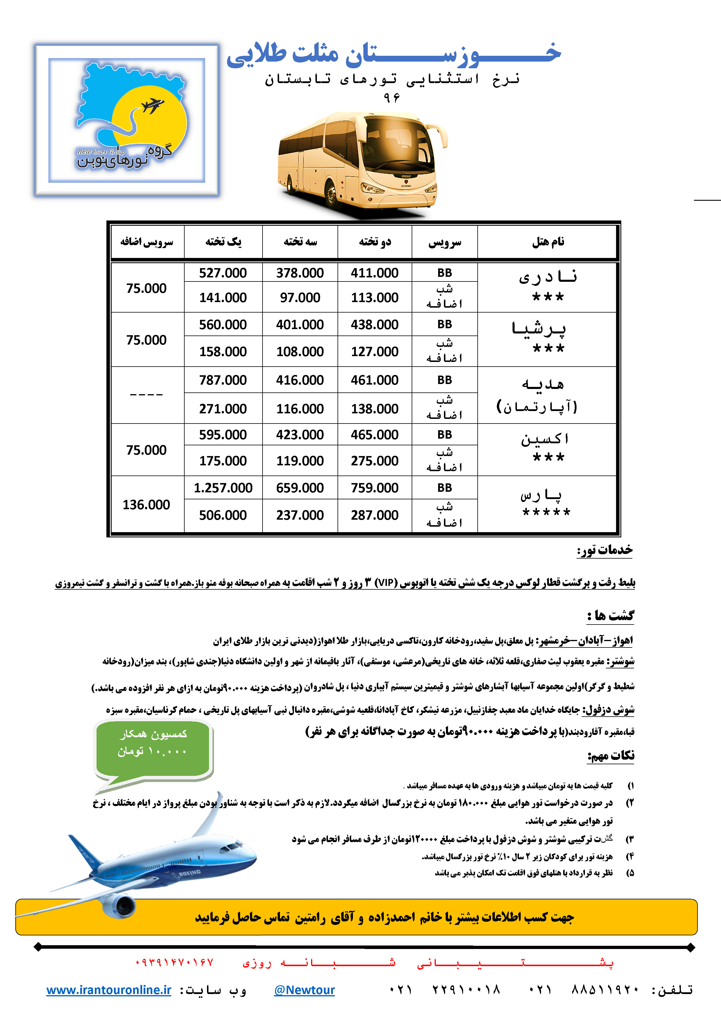 اقامت در هتل 5 ستاره هتل پارس است و اقامت در هتل 2 ستاره هتل پرشیا می باشد